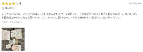 全体的に満足度の高い口コミばかりですが、「色味が選べなかった」「欲しいアイテムが入ってなかった」との声も聞こえました。