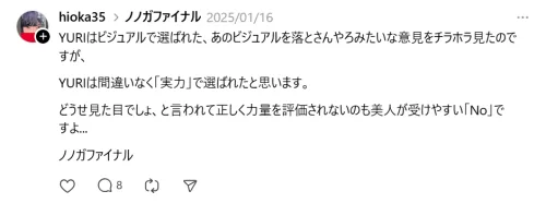一部SNSの投稿では、YURIについて「結局ルックスが評価されて選ばれた」という趣旨の意見が見られました。