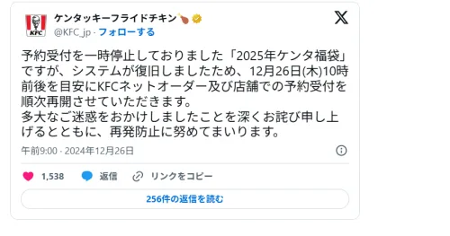 ★26日9:00公式Xにてシステム復旧を報告