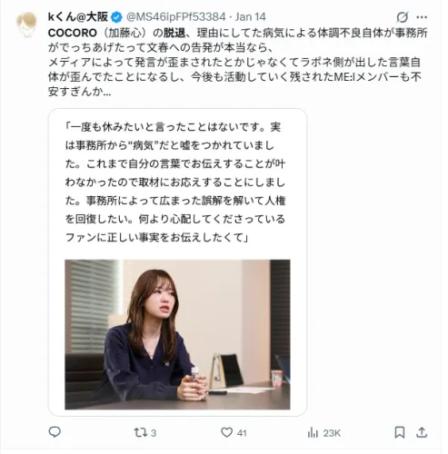 人気ガールズグループ ME:I(ミーアイ) の元メンバーである 加藤心(COCORO) が、所属事務所との間で脱退理由をめぐる認識の食い違いを告白し、波紋が広がっています。