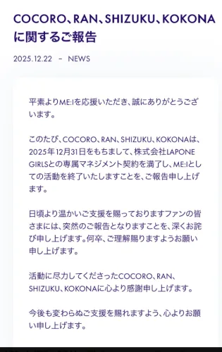 ME:I を巡っては、COCOROの他、RAN、SHIZUKU、KOKONAも2025年12月31日を以て契約満了となっています。