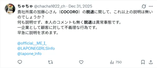 その後、2025年12月22日に事務所からCOCOROについて2025年12月31日付で 専属契約満了 とし、脱退が発表されました。