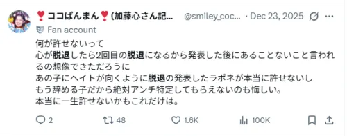 脱退の経緯②:脱退に対して本人からのコメント(2025年12月24日)