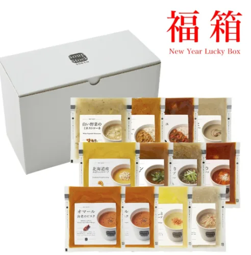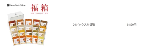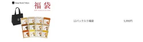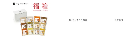 | 【第二弾発売日】 2025年12月16日(火)12:00~ | ●【楽天市場】 スープストックトーキョー 福箱(12パック) ●【Amazon】soupstok福箱 ●【Yahoo!ショッピング】スープストックトウキョウ |